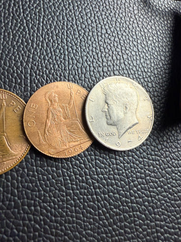 Made from a genuine KENNEDY half dollar & one genuine copper, vintage English penny or Mexican Centavo.